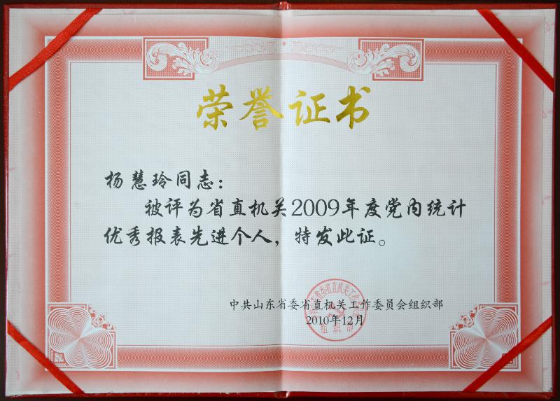 杨慧玲被评为省直机关2009年度党内统计优秀报表先进个人